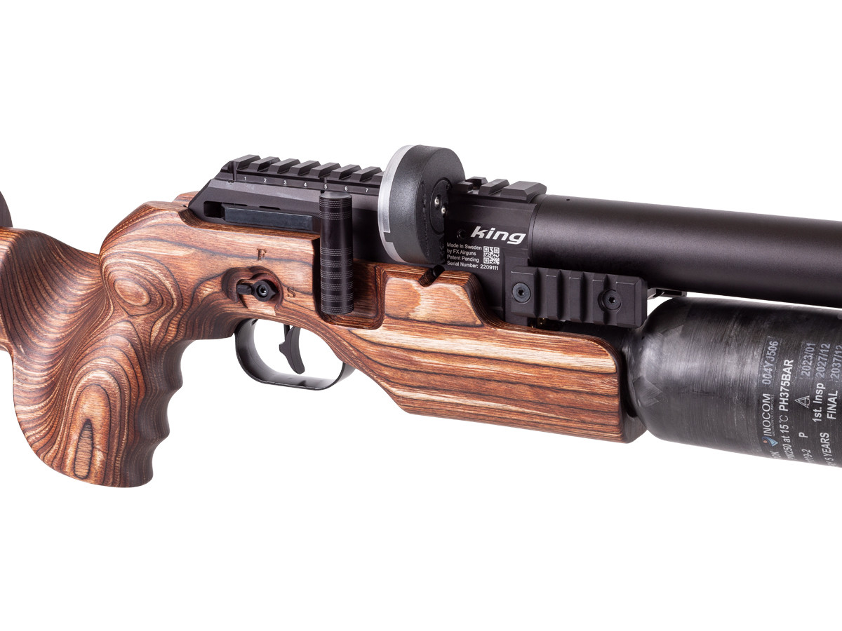 Plenum: Binnenin het plenum bevindt zich de gereguleerde perslucht die klaarstaat voor het volgende schot. De FX King heeft een substantieel 156 cc Magnum XL plenum rond de loop, met afdoende luchtvoorraad om zelfs de grootste en zwaarste 6.35 slugs te verschieten.
