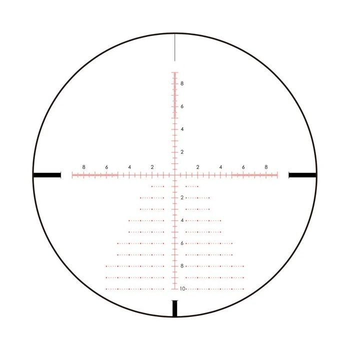 Het dradenkruis bevindt zich in het eerste beeldvlak. Dit betekent dat het dradenkruis vergroot met de vergrotingsverandering en dat de afstandsschatting met behulp van de dradenkruismarkeringen op alle vergrotingsniveaus werkt. Door het ontwerp hebben veranderingen in de vergroting met een dradenkruis in het eerste beeldvlak geen invloed op de trefferplaatsing.